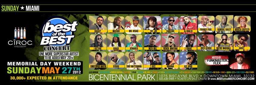 • Best of the Best Concert 2012 Memorial Day weekend in downtown Miami FL  It’s that time of the year again! The legendary Best Of The Best Concert 2012 is getting closer! Each year a star studded line up that gets only  better! Don’t sleep!